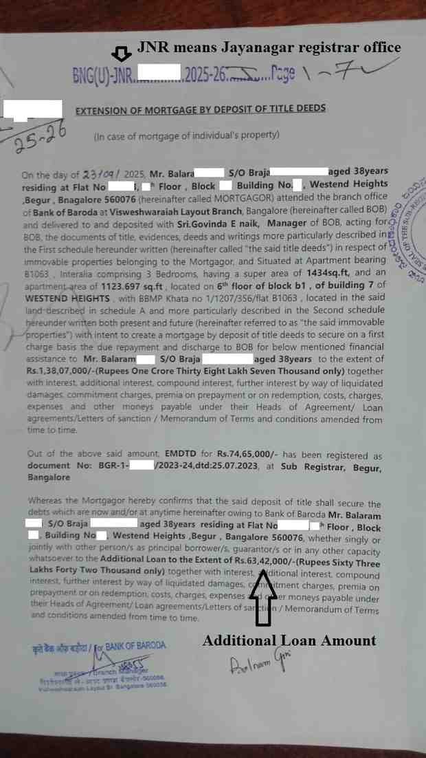 The additional loan of Rs 63.42 lakhs was successfully registered on 23rd September 2025 at the Jayanagar Sub-Registrar’s Office.