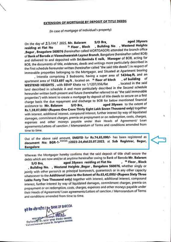 In July 2023, one of my clients availed a home loan of Rs 74.65 lakhs from Bank of Baroda. The MODT for this loan was registered at the Begur Sub-Registrar’s Office, Bengaluru.