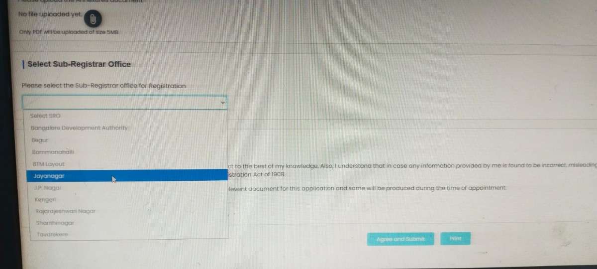 In this particular case, the previous MODT was registered at the Begur Sub-Registrar Office, but for the additional loan, we selected the Jayanagar Sub-Registrar Office from the available list. (See the highlighted portion in the image below.)