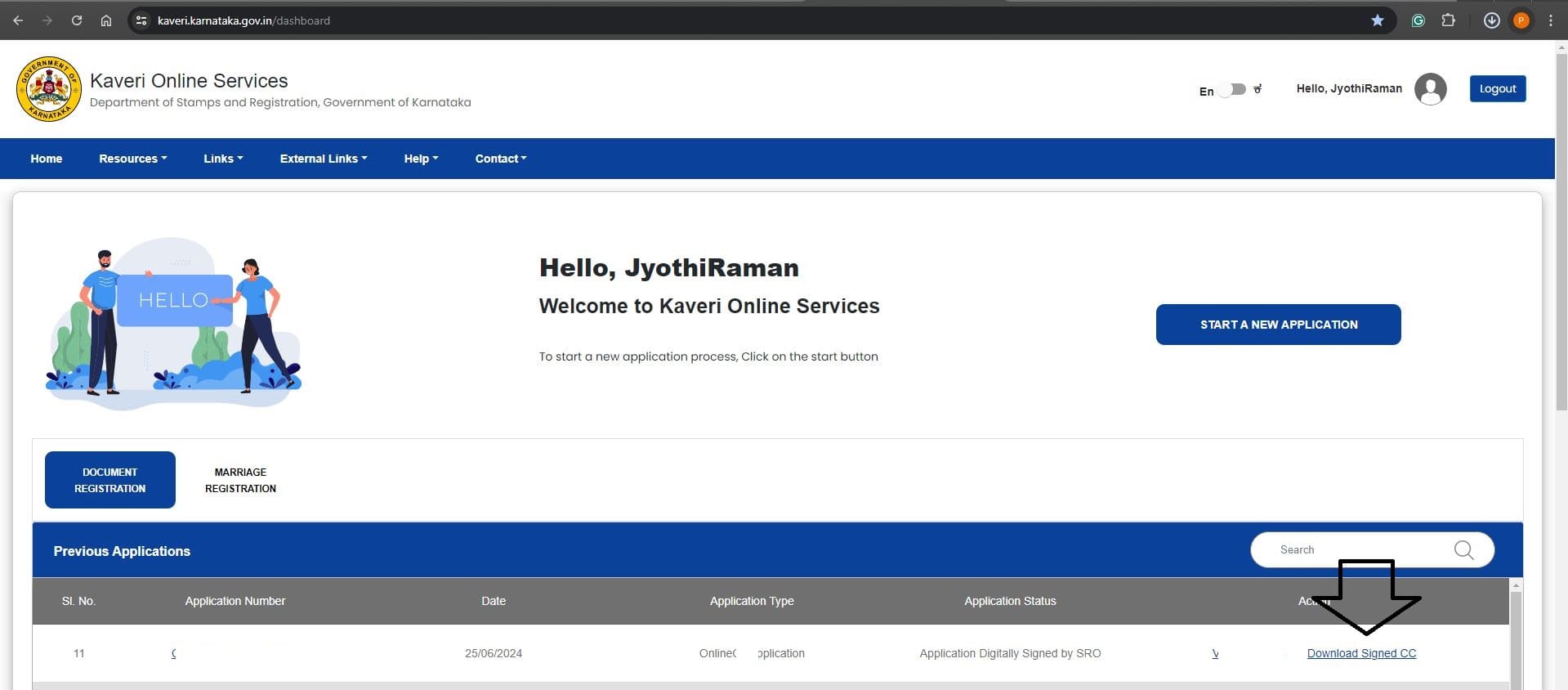 The certified copy will be ready for download within 3–4 working days. Again, log in to Kaveri Online Services and find Download on the home page. We highlighted the download option image below for your reference