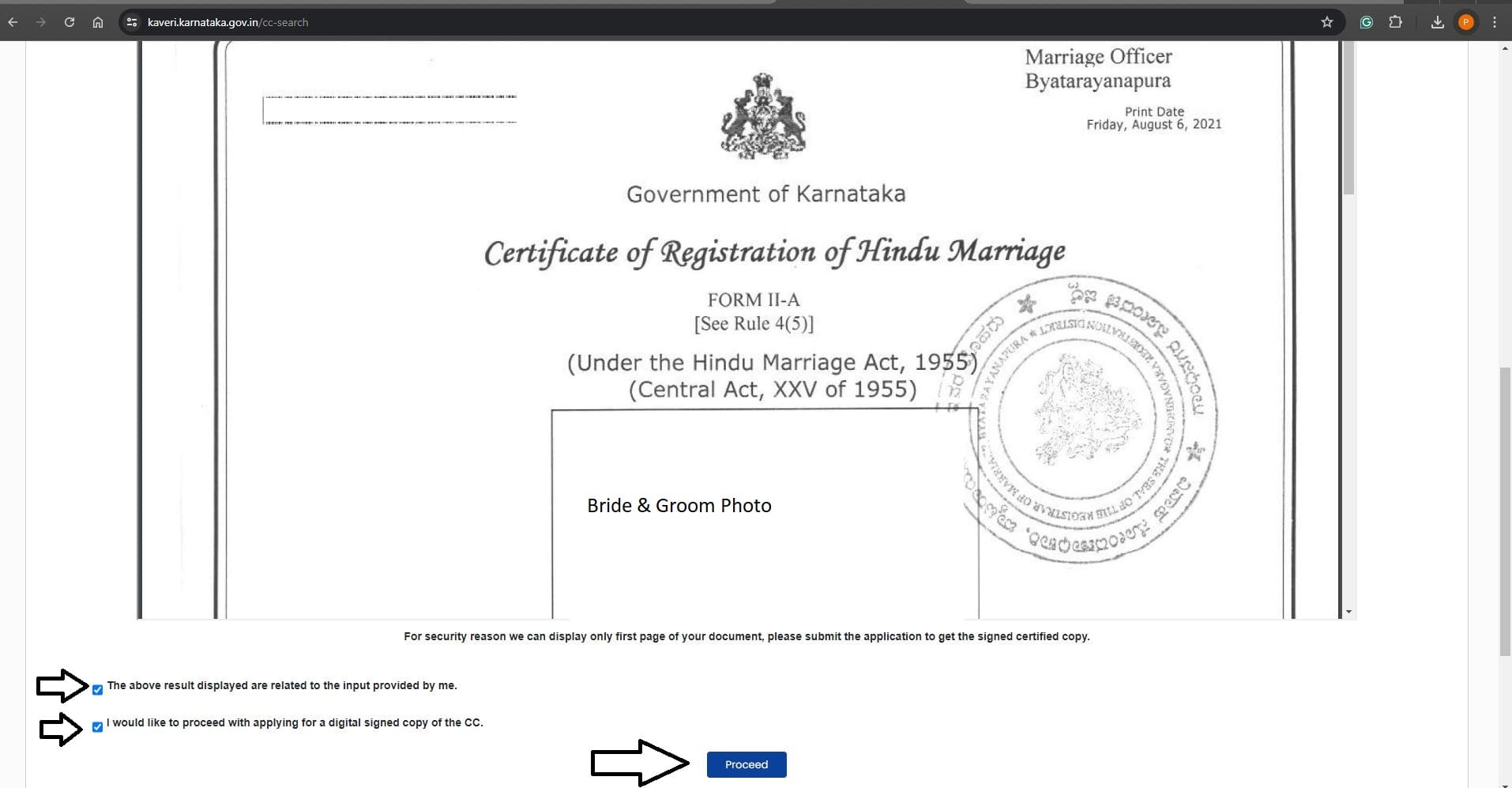 Information copy displays. If the information copy belongs to you, Check the Terms & Conditions and Click on Proceed. Refer to the arrow marks in image below