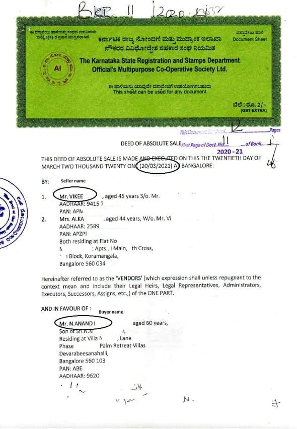 - Column 5: Seller’s Name – The name of the previous owner, e.g., VIKEE, should appear exactly as in the sale deed.