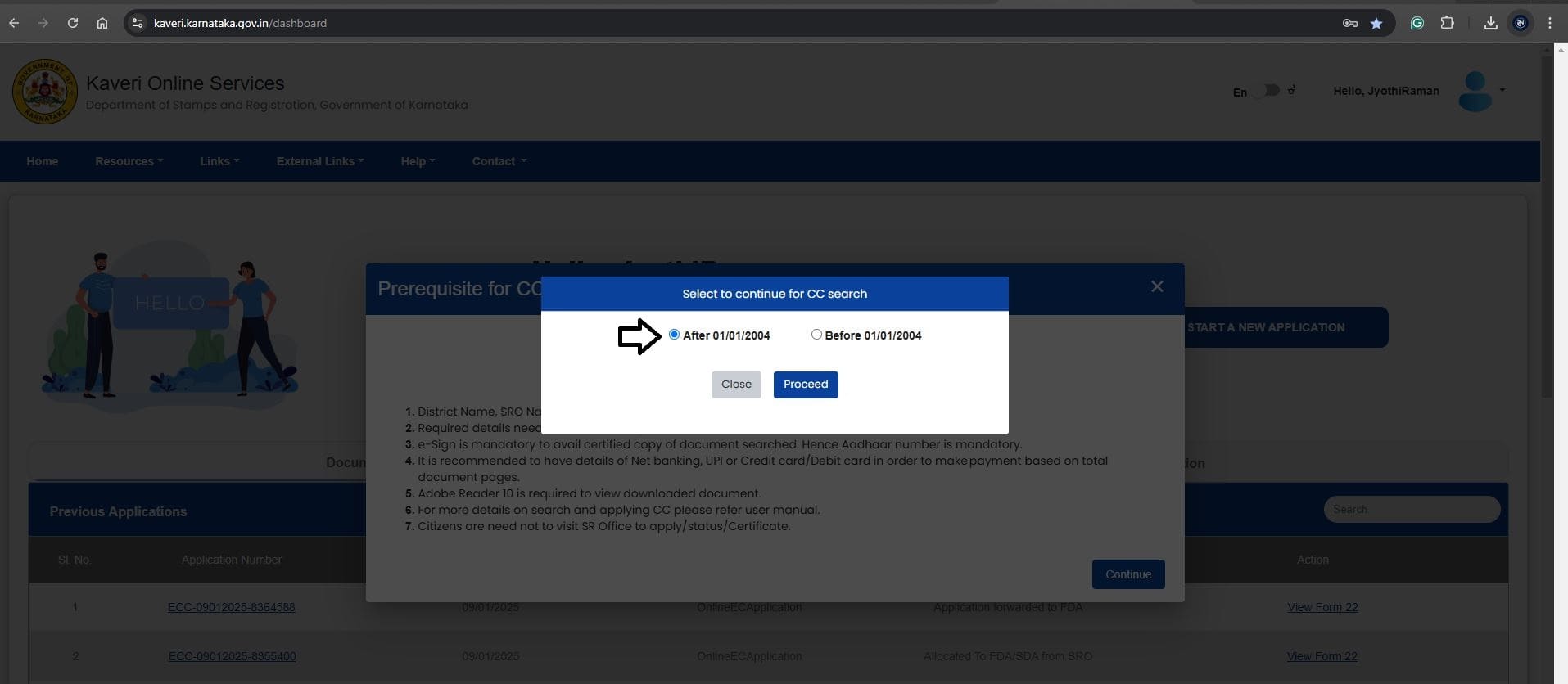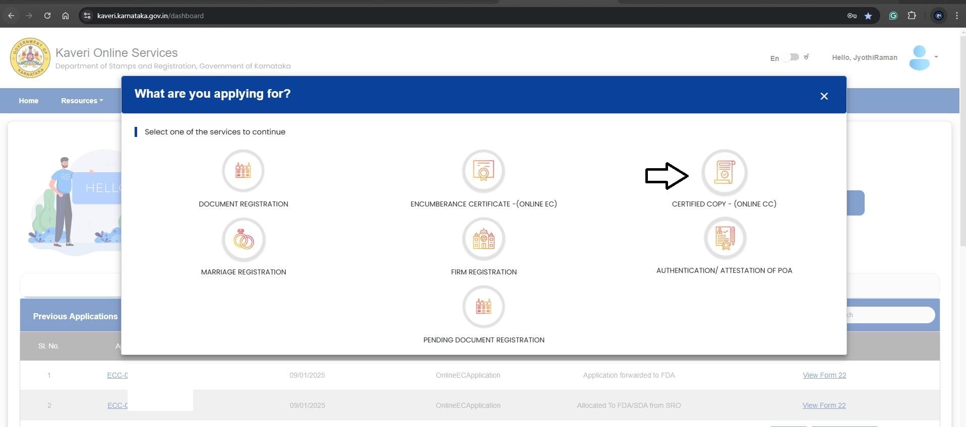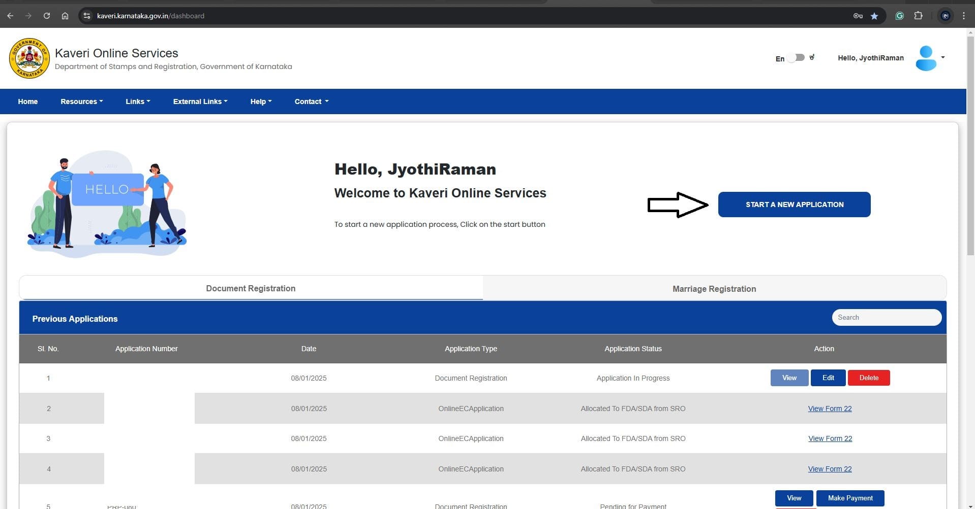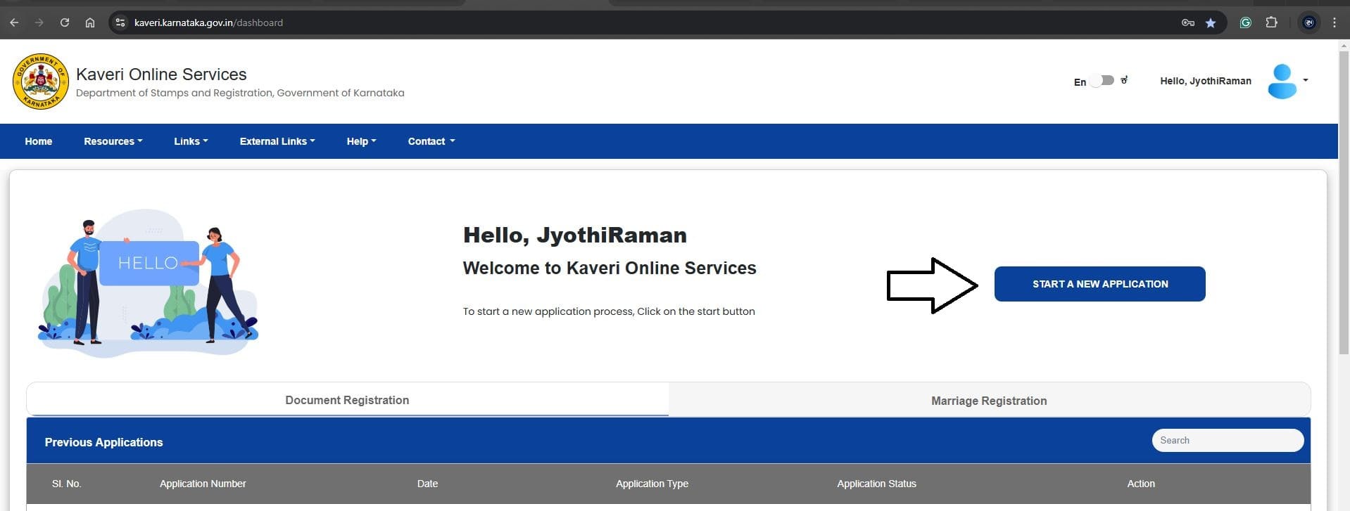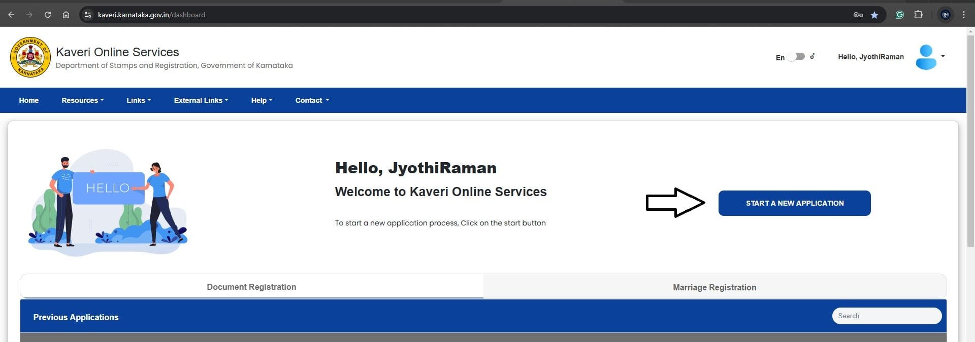 Log in to Kaveri Online Services and select START A NEW APPLICATION. Refer to the image below