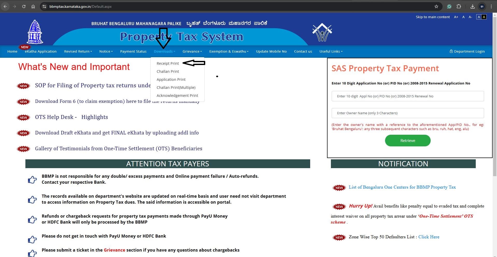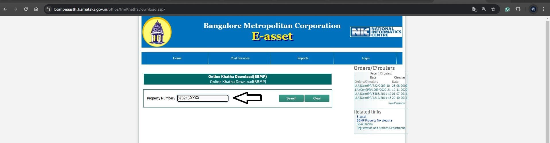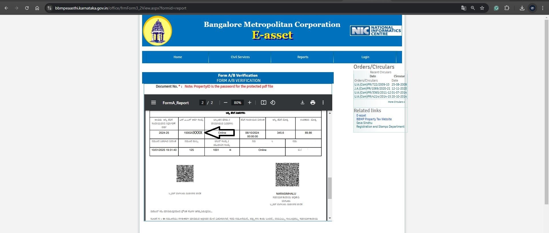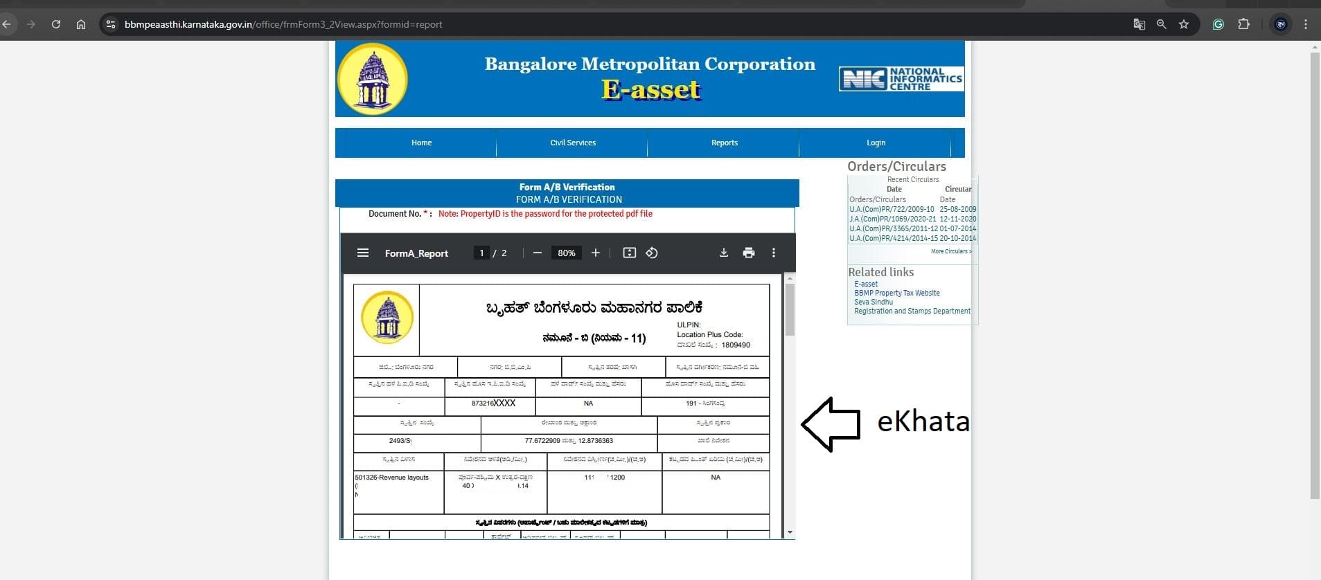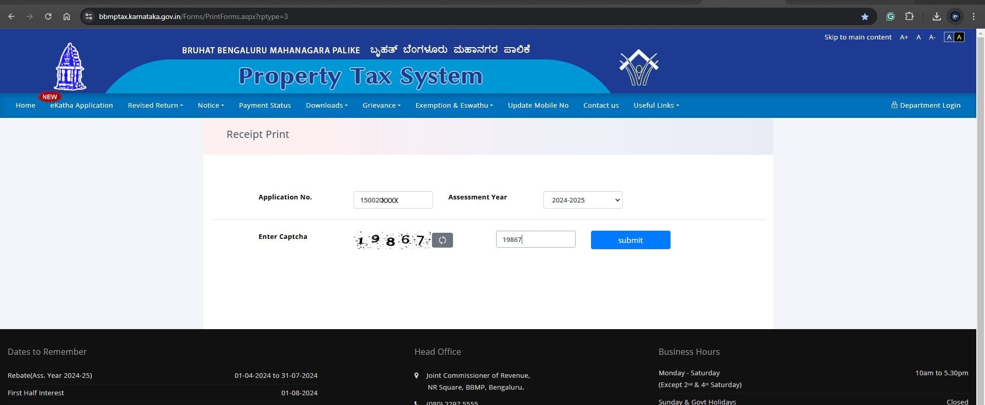 As per the ekhata, the tax application number is 150020XXXX. Log in to the municipality website, in our case, the BBMP website.