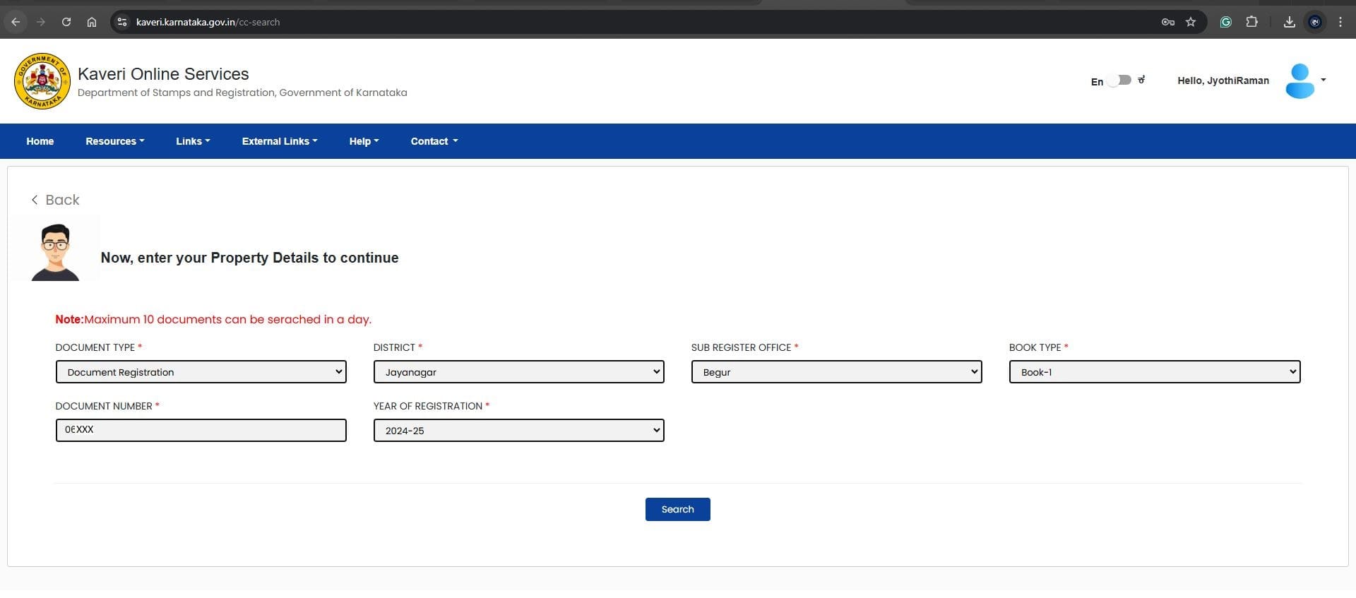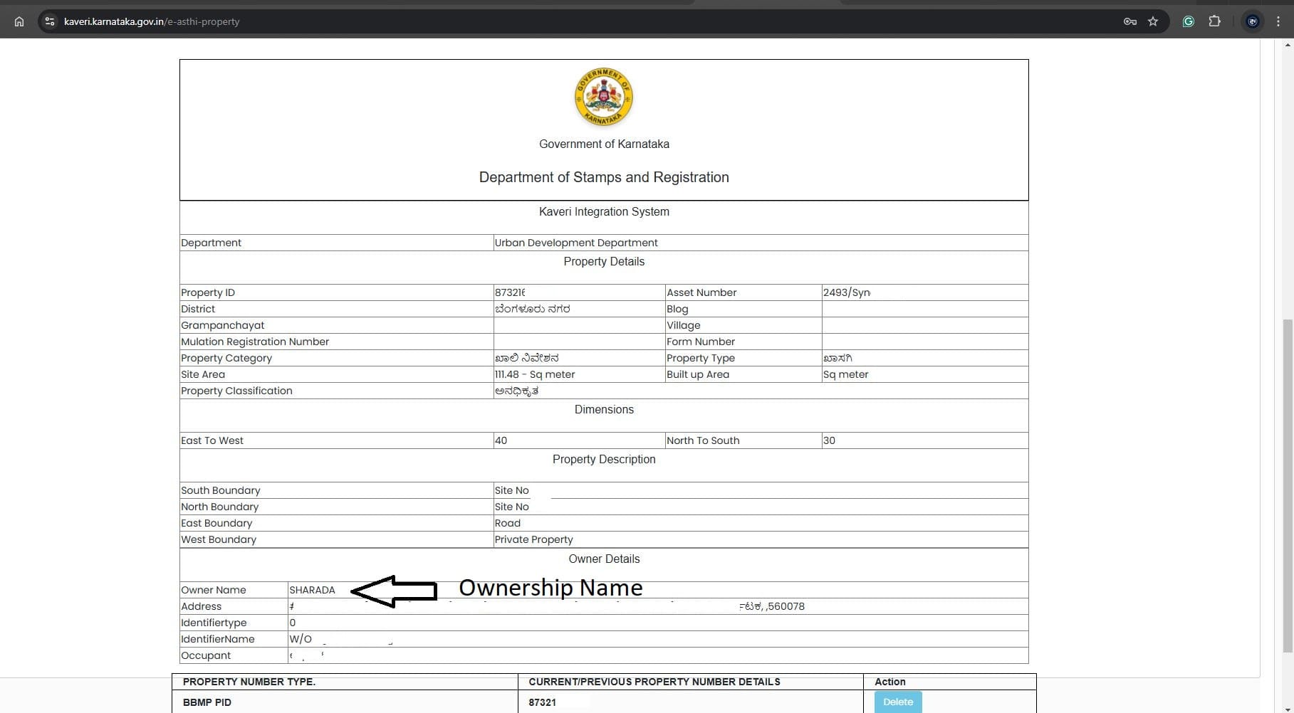 The property belonged to Ms. Sharada, Property No. 34, Village XXXX (name withheld for privacy). With just this information, we were able to download and verify the following documents: