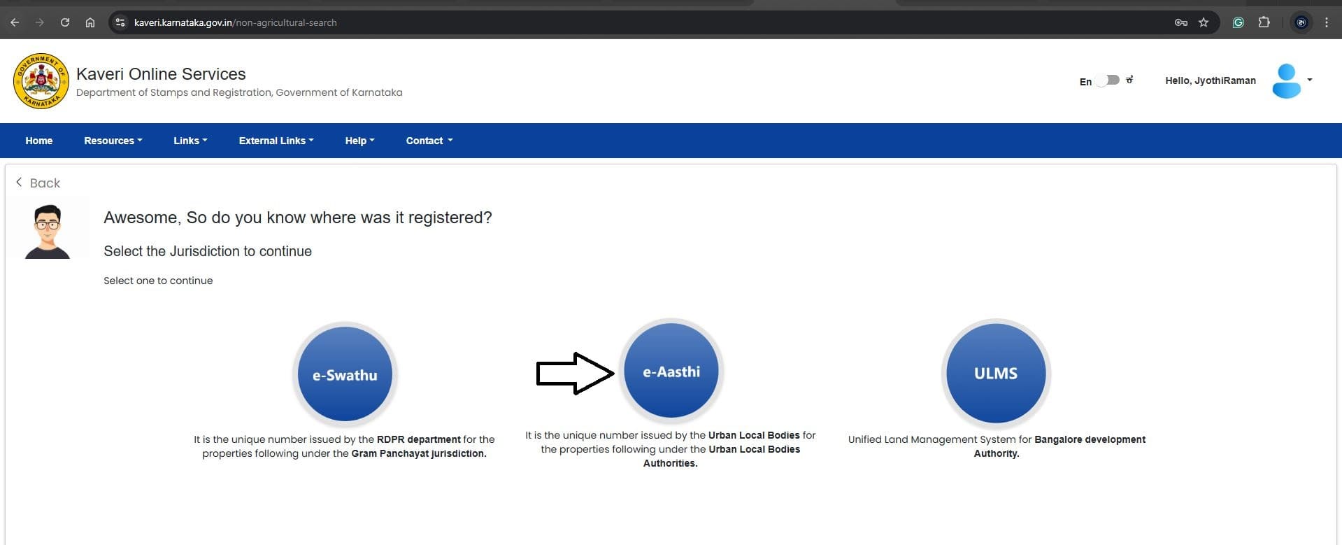 Select the Jurisdiction. In my case, the property is in the BBMP jurisdiction, so I selected e-Aasthi. Refer to the image below