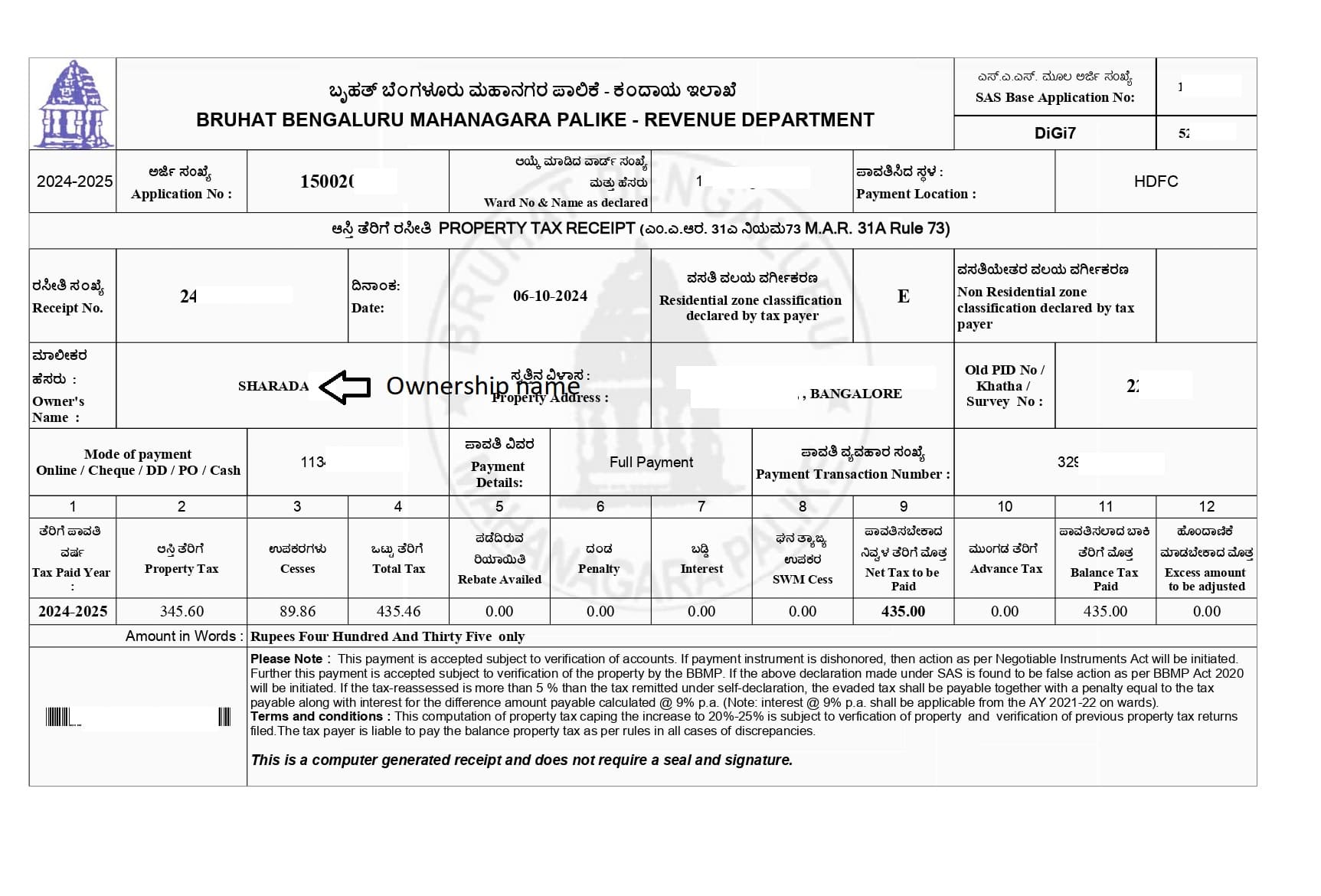 We highlighted the ownership name SHARADA in the below property tax receipt