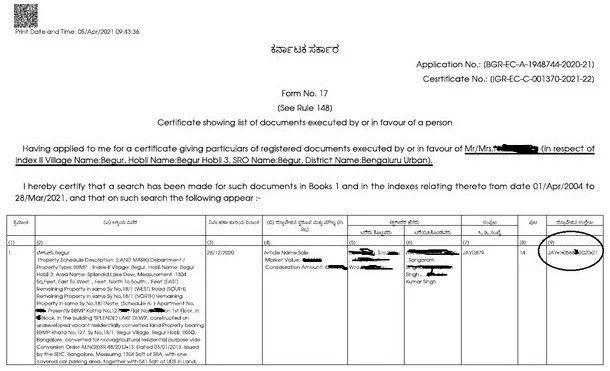- In the Encumbrance Certificate (EC), under the transaction entry for the respective property.