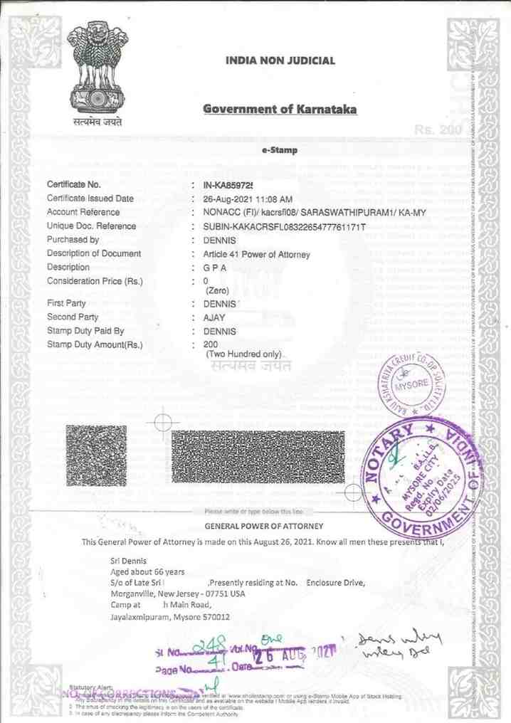 For example, one of our clients in India planned to sell his property in Bangalore. However, during the registration of the Sale Deed, he was scheduled to be in New Jersey, USA. Before leaving, he executed a General Power of Attorney (GPA) in India on Rs. 200 non-judicial e-stamp paper and had it notarized.