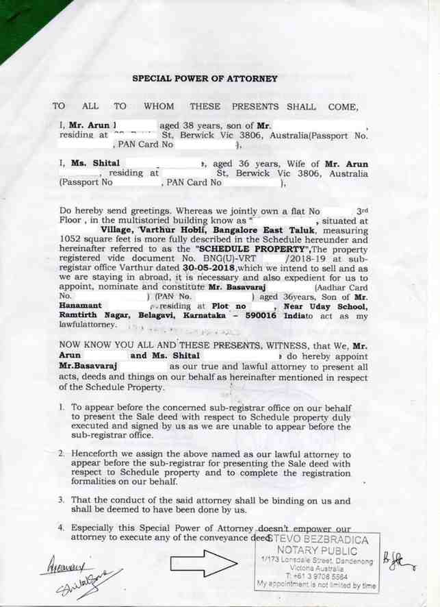For instance, our clients Mr. Arun and Mrs. Shetal, who reside in Australia, jointly own a 2BHK flat in Bangalore. As they were unable to be physically present for the transaction, they executed a Special Power of Attorney (SPOA) before a Notary Public in Australia. We have highlighted the notary attestation in the SPOA executed below for reference: