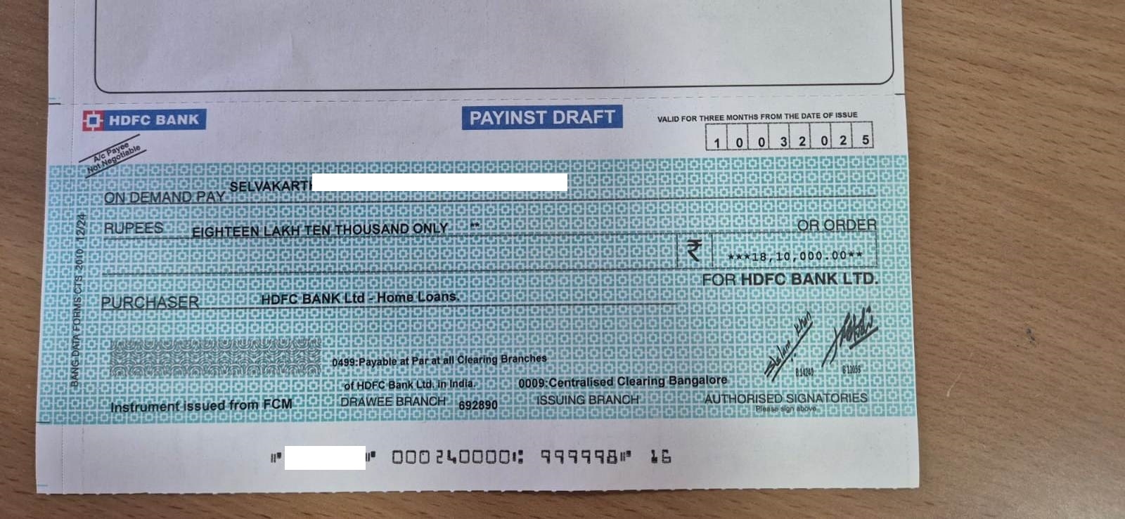 - Furniture Loan: Rs. 18.10 lakhs sanctioned against a value of Rs. 28 lakhs. Refer to the Demand Draft image below