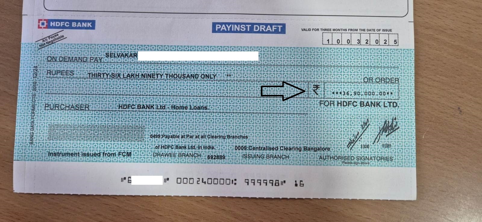 - Property Loan: Rs. 36.90 Lakhs sanctioned against a purchase value of Rs. 41 Lakhs. Refer to the Demand Draft image below