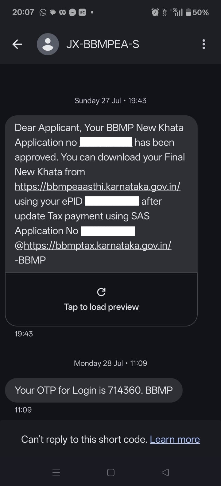 (If you selected the option indicating unpaid property tax at the beginning, this SMS will contain your new Property Tax Application Number, which you can use to make the property tax payment on the BBMP property tax portal)