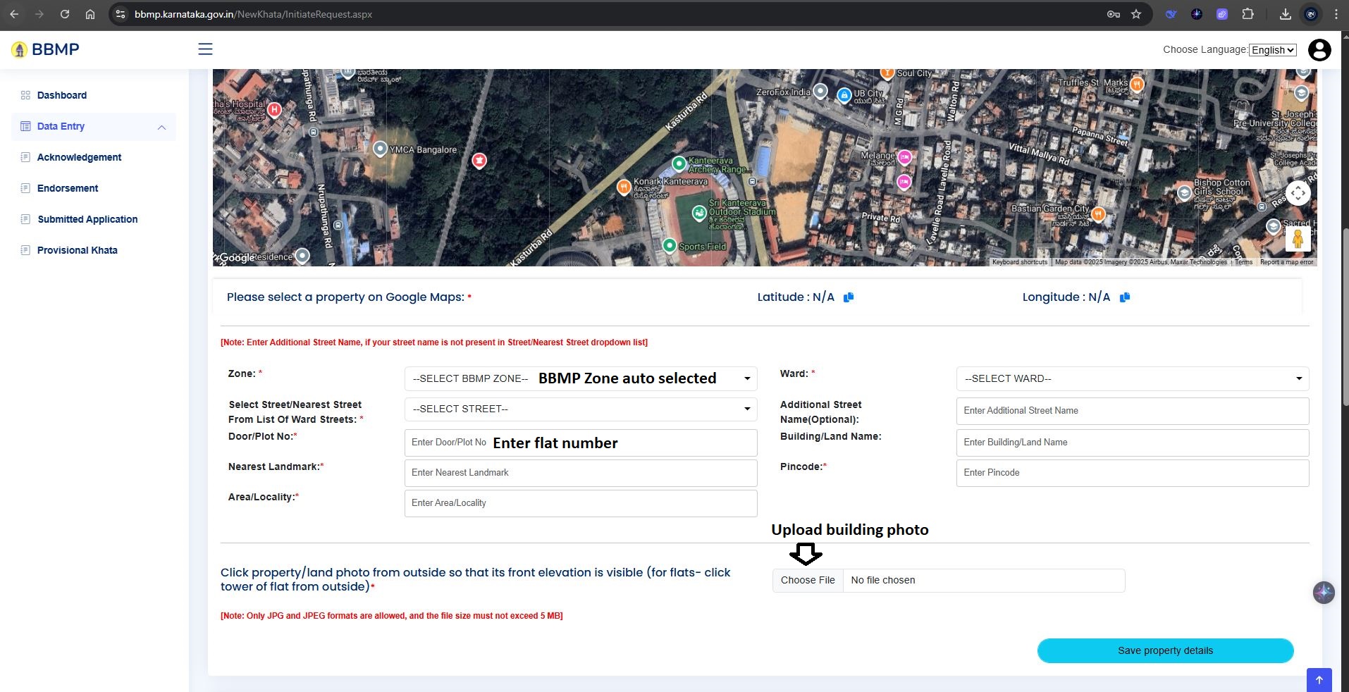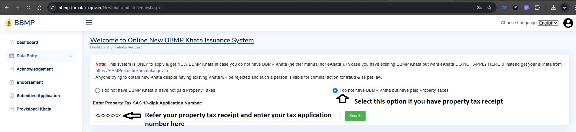 Since we had already paid property tax, we selected: “I do not have BBMP Khata but have paid Property Taxes” and entered our 10-digit property tax application number. Refer to the highlight in image below