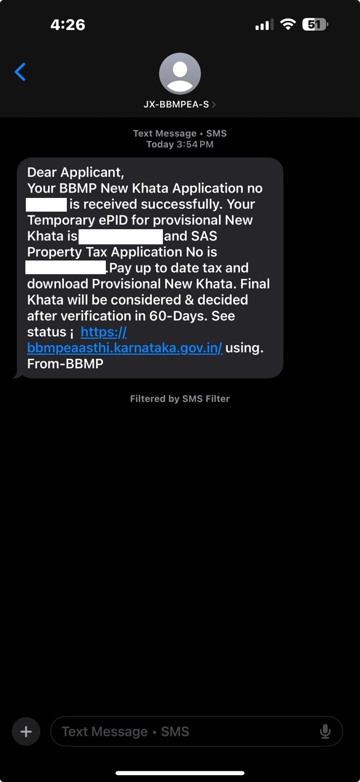 Within 60 days, BBMP sent an SMS confirming that our e-Khata was approved. Refer to sms screenshot below