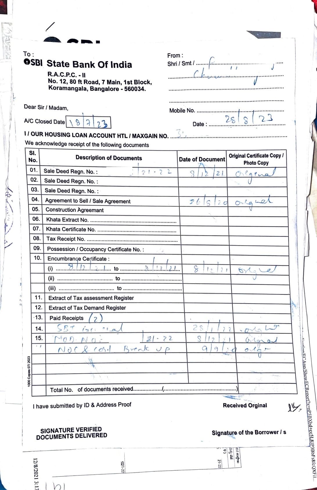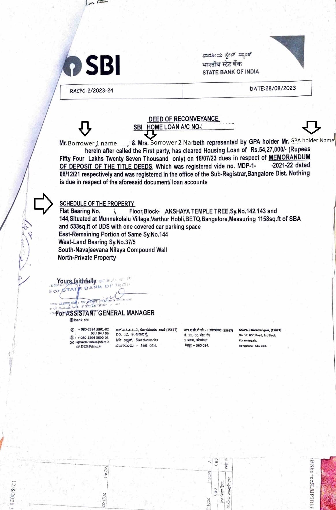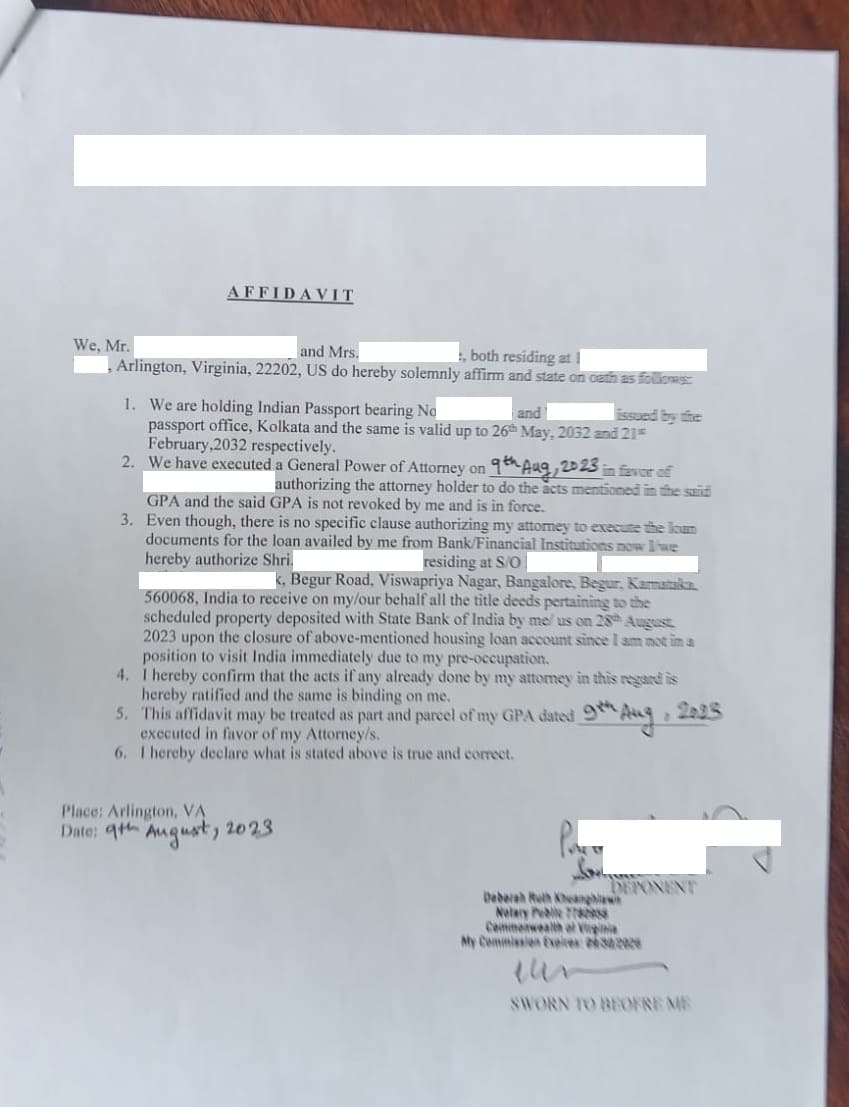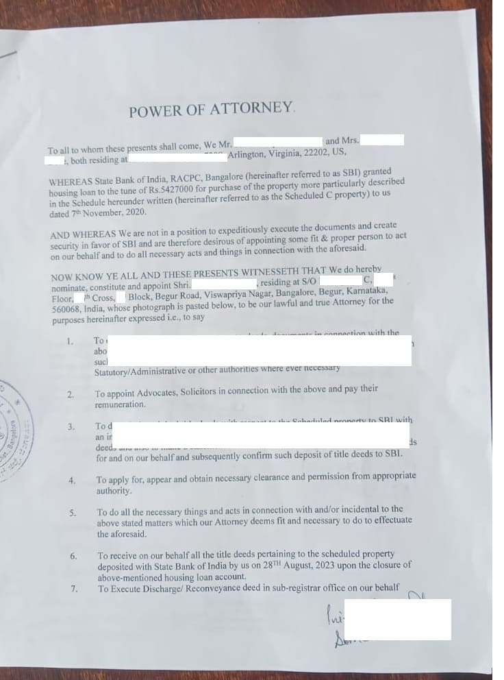 Recently, they closed the loan and obtained the Loan Closure Letter from SBI via email. Since they could not travel to India, both husband and wife executed a General Power of Attorney (GPA) in favor of their trusted friend in Bangalore, authorizing him to collect the original property documents from SBI.