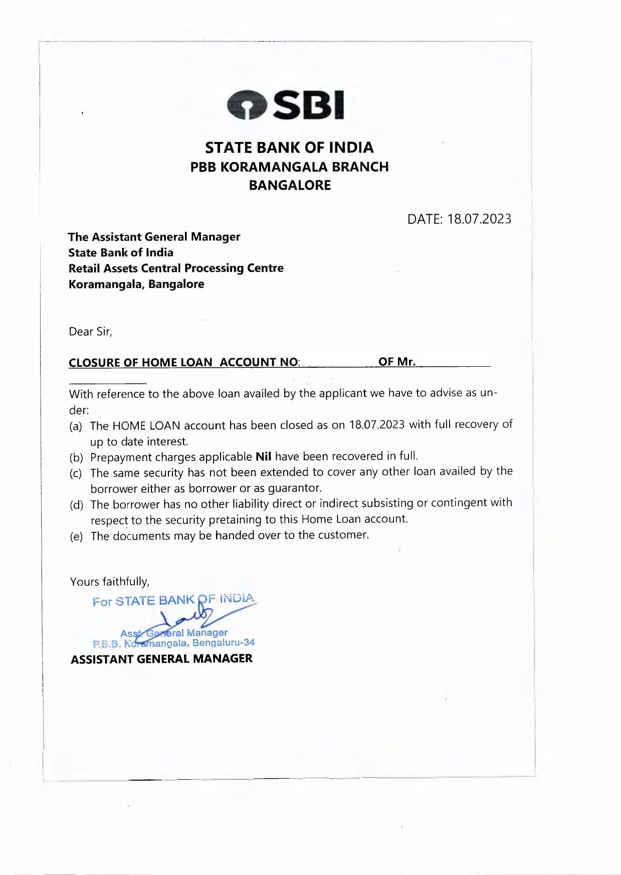 Along with the closure letter, SBI also specifies the date, time, and RACPC address where the original property documents can be collected.