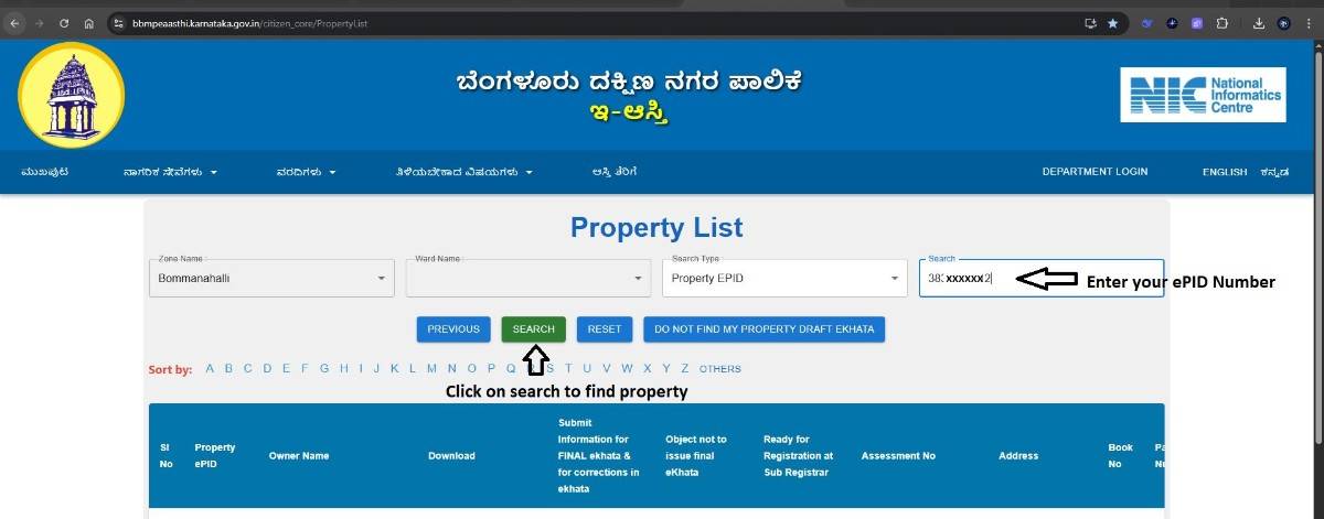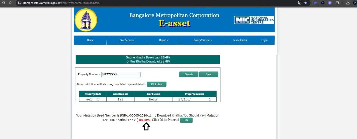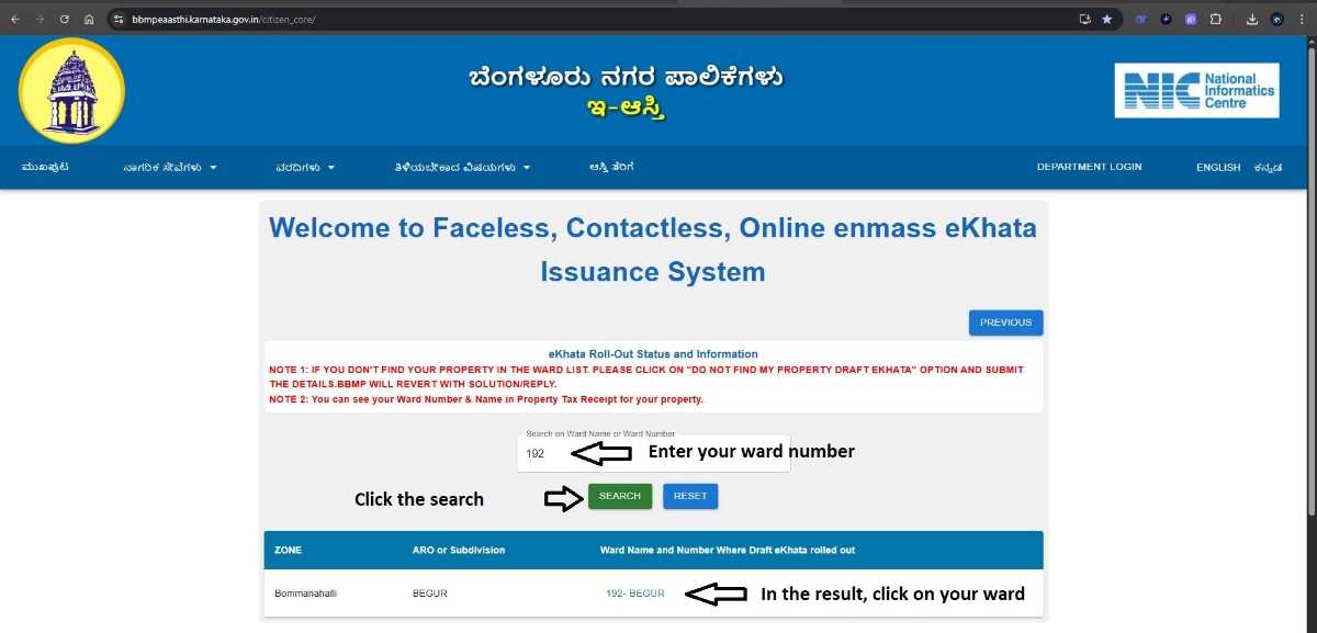 • Entered BBMP Ward Number: We entered the BBMP ward number (192) to locate the property within the portal.