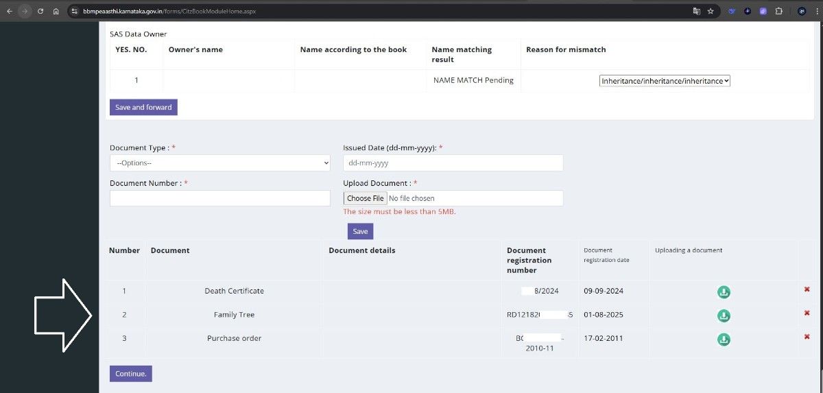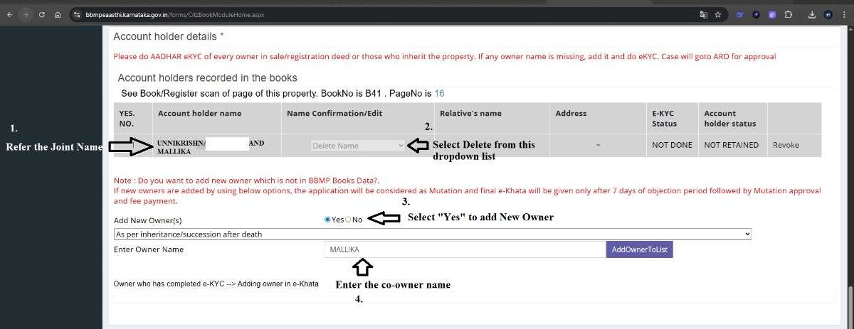 While submitting the e-Khata application, delete the deceased co-owner’s name and retain only the surviving co-owner’s name. Specify “Inheritance” as the reason for the change.