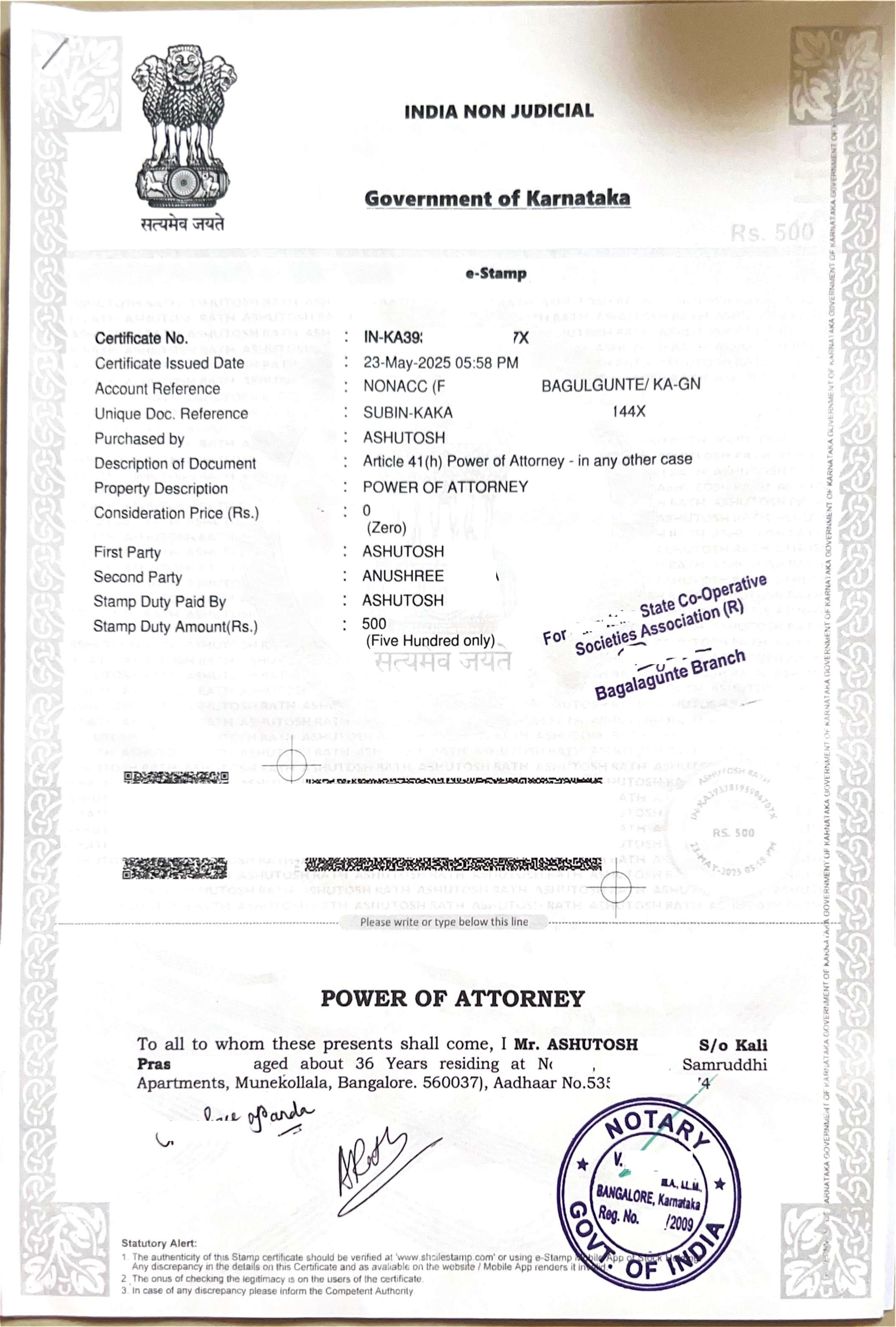 A Registered Power of Attorney executed at the sub-registrar's office and officially recorded in the registrar's database. The registered POA is mandatory for property-related transactions in the sub-registrar's office.