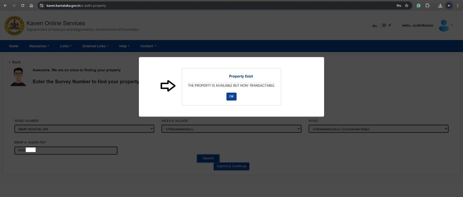 - Registration: Once verified, we logged into Kaveri portal, entered the ePID number, and successfully completed the property registration without encountering the non-transactable issue. See the transactable image below for reference